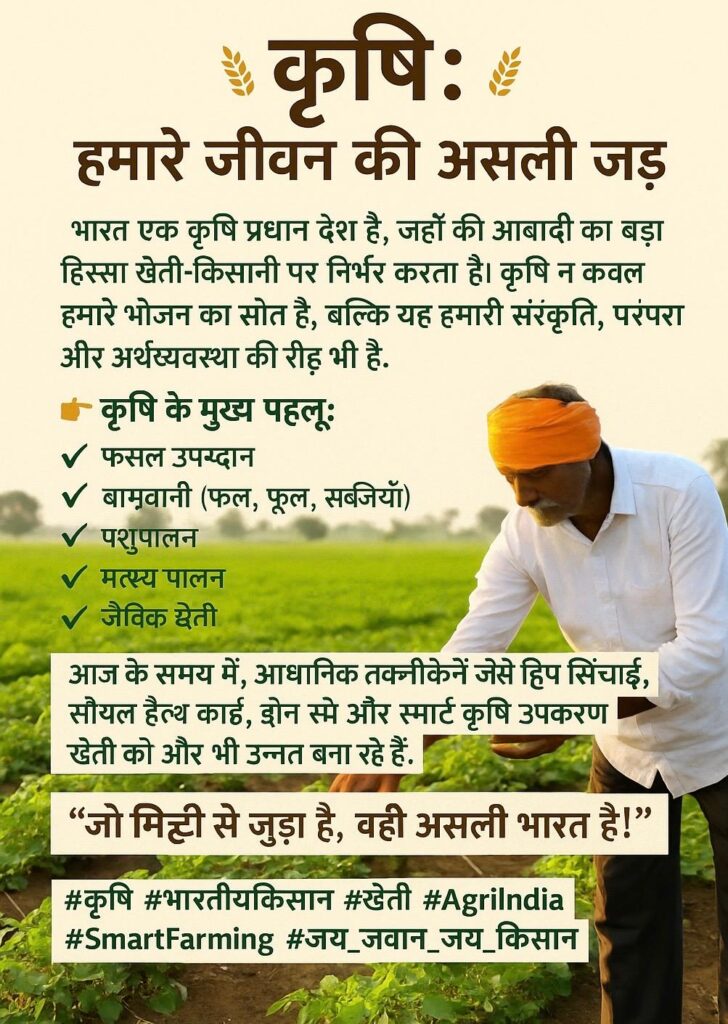 भारत एक कृषि प्रधान देश है, जहाँ की अधिकांश जनसंख्या खेती-किसानी से जुड़ी हुई है। यह केवल एक पेशा नहीं, बल्कि हमारी संस्कृति, परंपरा और जीवनशैली का अभिन्न हिस्सा है। सदियों से किसान धरती माँ की सेवा कर रहे हैं और अनाज, फल, सब्जियाँ, दूध व अन्य उत्पादों के माध्यम से पूरे देश का पेट भरते आ रहे हैं।